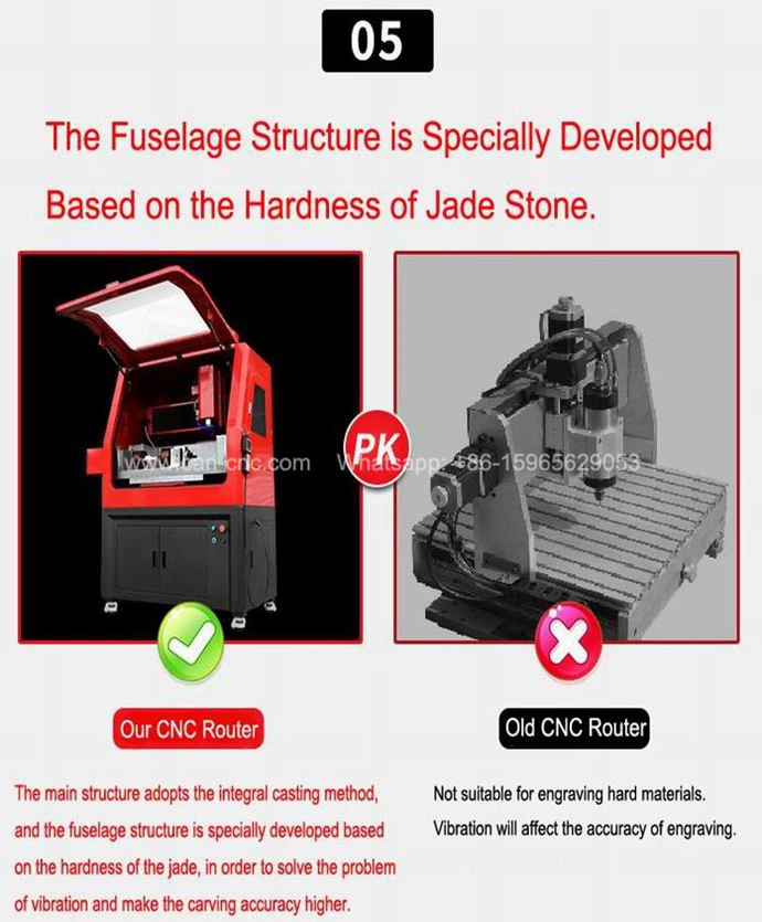 Die Hauptstruktur verwendet die Integralgussmethode, und die Rumpfstruktur wurde speziell auf der Grundlage der Härte der Jade entwickelt, um das Vibrationsproblem zu lösen und die Schnitzgenauigkeit zu erhöhen.
